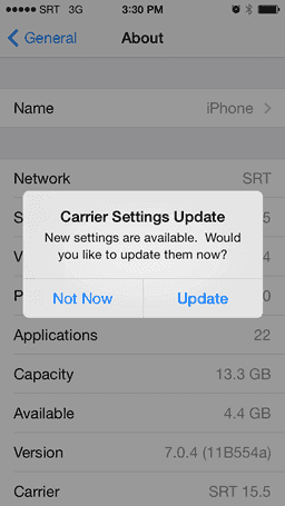 Update Carrier Settings Ipad 3 Getting a "carrier settings update" message on your iPhone or iPad, but not sure what it's all about? Then, read this FAQ to learn more. The overall Carrier Settings Update for the iPhone and iPad are generally small on newer devices like the iPhone 6, iPhone 6 Plus, iPad Air 2 and iPad Mini 3. ... Document Viewer